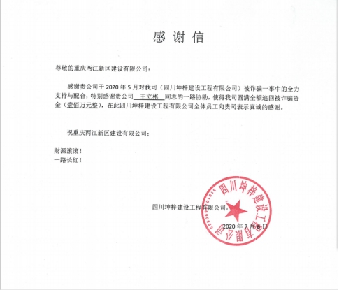 今年5月,四川坤梓建設工程有限公司兩名員工到兩江建設公司去請求協助追討被詐騙資金事宜。兩江建設公司安排專人全程協助該司員工,積極向公安機關提供相應證明材料。最終,經過二十余天的努力,公安機關成功破獲該案,四川坤梓建設工程有限公司已全額追回被詐騙的資金。