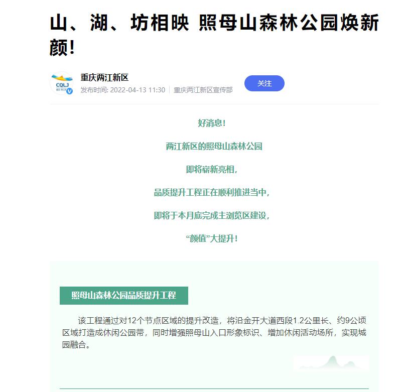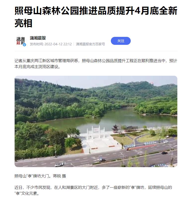 近期,包括兩江新區、重慶市城管局、搜狐網、瀟湘晨報等多家單位微信公眾號或視頻號報道了兩江建設公司承建的照母山森林公園品質提升項目建設成果,在網絡上引來了不少關注度。