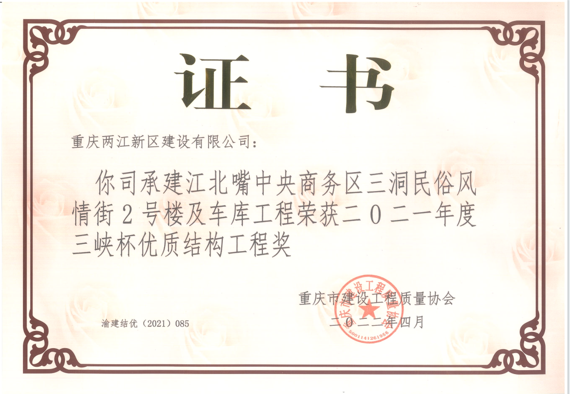 近日,重慶市工程建設質量協會公布了2021年度三峽杯優質結構工程獎評選結果,由兩江建設公司承建的“江北嘴中央商務區三洞橋民俗風情街——主體工程”2號樓及車庫工程榮獲2021年度“三峽杯優質結構”獎項。