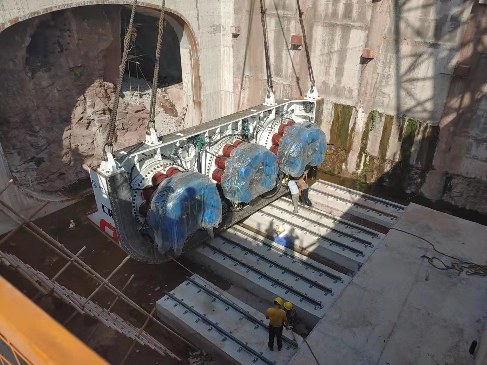 世界首臺全斷面硬巖矩形頂管機盾體順利完成吊裝下井作業(yè)