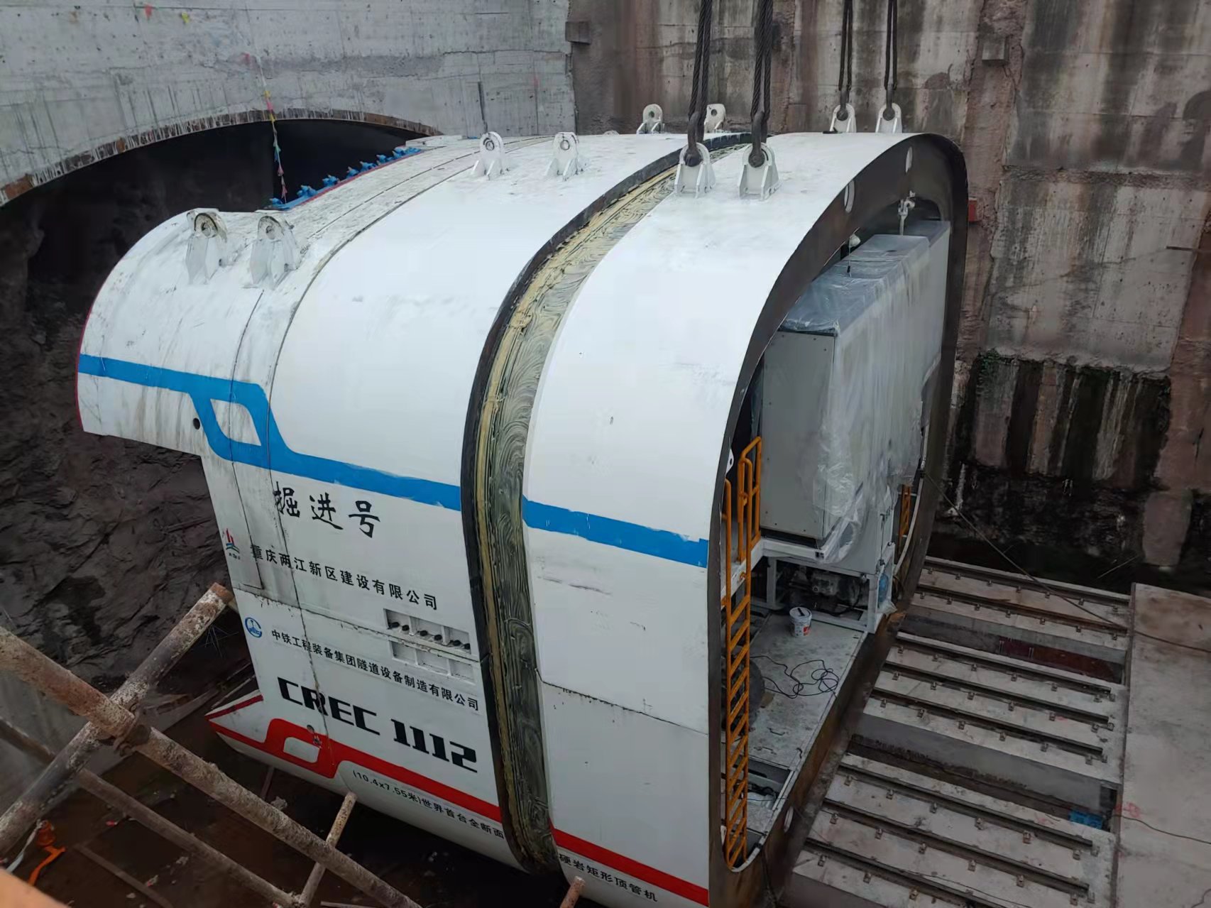 8月31日上午7時許,由兩江建設(shè)公司承建的北部新區(qū)人和組團N區(qū)道路立交C交通節(jié)點配套A匝道頂管工程迎來了重大施工節(jié)點。開挖面寬10.42m、高7.57m、重達500噸的盾體順利完成吊裝下井作業(yè)。此次吊裝下井的矩形頂管機是世界首臺全斷面的硬巖矩形頂管機,同時這也是該設(shè)備的首次下井吊裝作業(yè)。