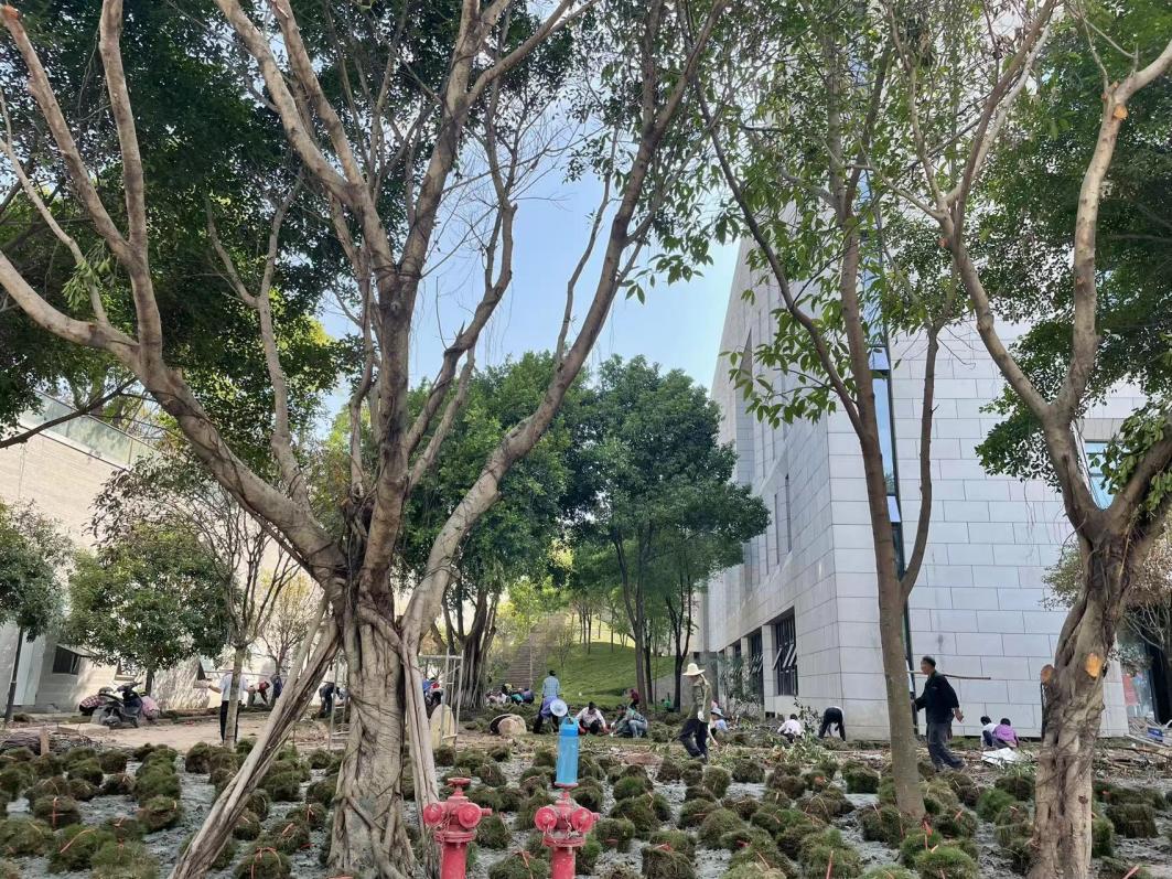 由于對院區(qū)內進行美化改造的時間緊迫,兩江建設公司安排近200余人搶工突擊,栽植草皮、完成修枝和清理工作。兩江建設公司科學組織,在搶工的同時也綜合考慮天氣因素,根據(jù)植物不同的使用功能和性質進行科學設計,合理布局,滿足植物各自生長所需的產地條件,合理栽植,精心組織實施,提高成活率,同時派專人進行養(yǎng)護管理。做到種一棵活一棵,種一片活一片。