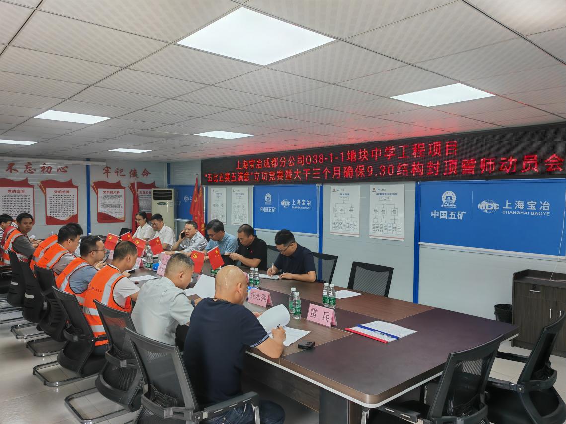 6月26日上午,O38-1-1地塊中學工程施工單位組織召開“五比五賽五滿意”立功競賽暨大干三個月確保9.30 結構封頂誓師動員會。兩江建設公司代建部經理萬榮、副經理陶東海,華興公司總監甘雄貴,上海寶冶集團工會主席陽剛,上海寶冶集團成都分公司黨委副書記、工會主席徐晨堯參加會議。