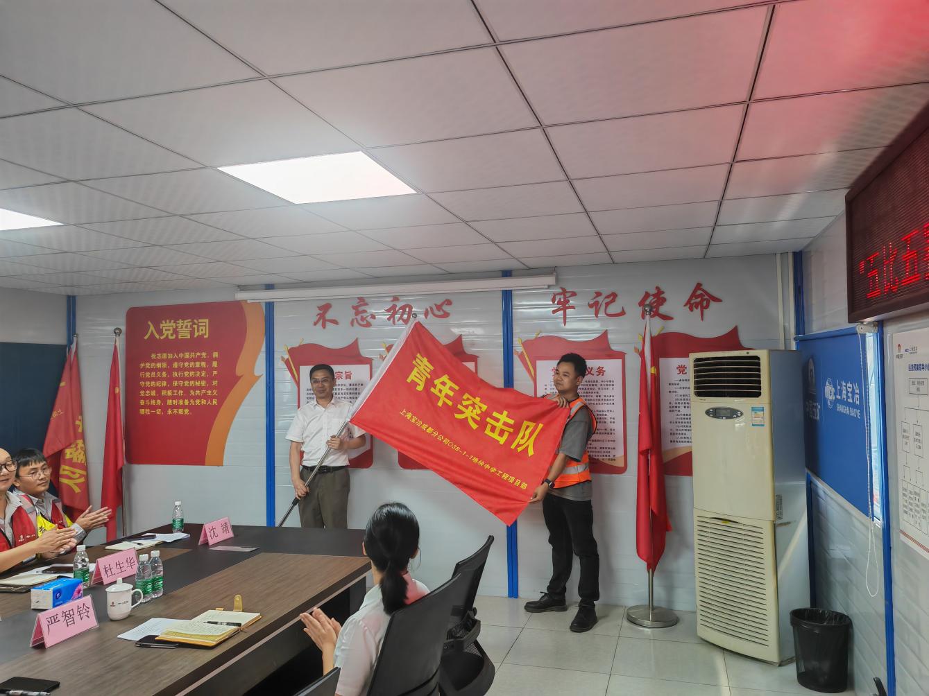整個項目施工任務重、難度大、工期緊。為充分調動全體施工人員的積極性,項目部決定開展“五比五賽五滿意立功競賽暨大三個月確保 9.30 結構封頂目標”勞動競賽活動。會議首先由施工單位宣讀“五比五賽五滿意”立功競賽暨大干三個月確保 9.30 結構封頂實施方案,再由主攻單位與項目部簽訂勞動競賽協議,后由兩江建設公司代表萬榮對參建各方安全質量方面做出具體要求。最后,由上海寶冶工會主席陽剛講話并向黨員代表汪林授“黨員先鋒隊”隊旗,成都分公司黨委副書記、工會主席徐晨堯向青年代表鄭睿授“青年突擊隊”隊旗。