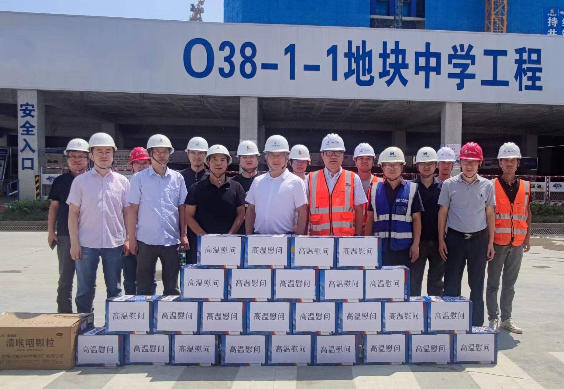 8月17日,江北嘴集團副總經理夏盛一行到由兩江建設公司代理建設的O38-1-1地塊中學工程項目部進行高溫慰問,為各參建單位生產一線員工送上了消暑降溫藥品和清涼飲料。